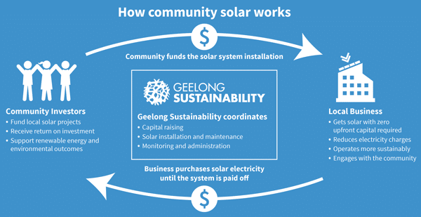 Our community solar model is designed to have win-win-win outcomes by providing a return on investment for community investors, giving affordable access to solar power for Geelong businesses and community organisations as well as the environmental benefits of more renewable energy and reduced carbon emissions in our region.