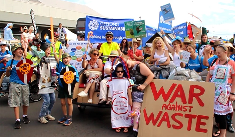 Although the skies threatened rain all day, it never eventuated and Geelong Sustainability had a very successful day at Pako Festa on 24 February. Our ​war on waste theme was well received by people attending especially the young. Together with our wonderful people-powered ‘chicken float’, 28 volunteers in bright blue GS T-shirts and a variety of costumes, including recyclable bottles, boomerang bags, waste warrior garb and plastic bag tutus, distributed 1000 copies of our Sustainability Directory and carried our big 6Rs banner (Rethink-Refuse-Reduce-Reduce-Reuse-Recycle-Rot) in the parade. We were also joined by the new Geelong chapter of Cycling Without Age, showing off the two new electric trishaws, which are about to hit the paths around Geelong with aged care residents from MACS.